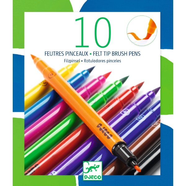 10 brush-tip felt pens in classic colours. Recommended for ages 6+